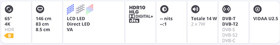 Schermo Piatto, Colore Black. Efficienza energetica A. QUALITA’-PREZZO 9.0 Design 7.3, Immagine 8.1, Suono 8.2, Sistema 9.0, Sintonizzatore e Connettività 8.6.