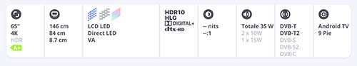 TLC marchio indiscusso degli ultimi anni, migliorato sia nel design, nelle funzioni che nel design, propone un modello slim da 65″ commercializzato dal 2020 .QUALITA’-PREZZO 9.5 Design 7.7, Immagine 4.1, Suono 7.0, Sistema 9.4, Sintonizzatore e Connettività 8.6. Risoluzione: 3840 x 2160 pixel – Frequenza: 60 Hz – WiFi + Ethernet – Casse integrate 2 X 10 W – Classe efficienza energetica: A+ – Android TV 9 Pie Marca TLC. Potete trovare una descrizione completa NON DISPONIBILE